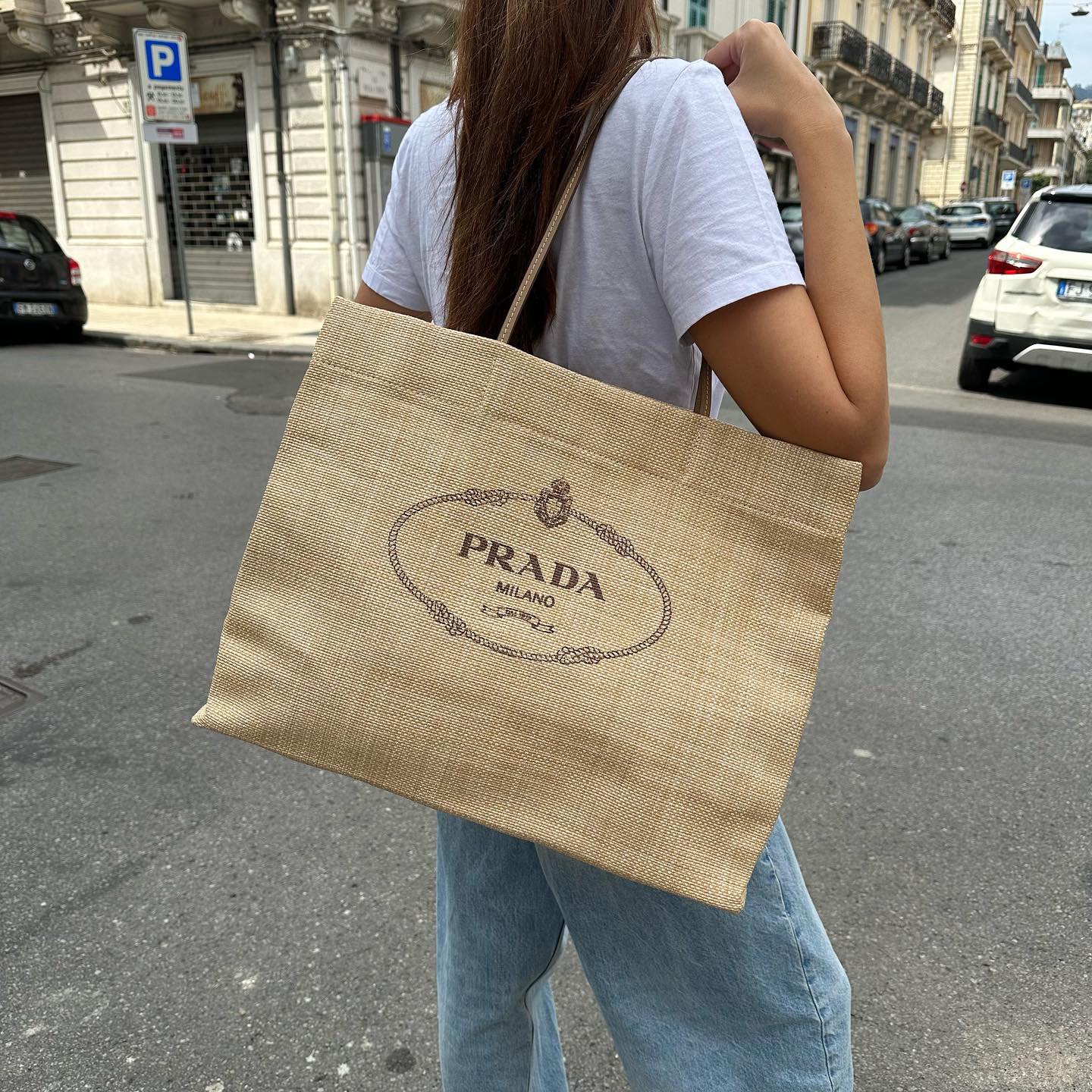 ラフィアとレザー仕上げのプラダ ギフトバッグ