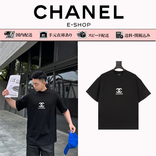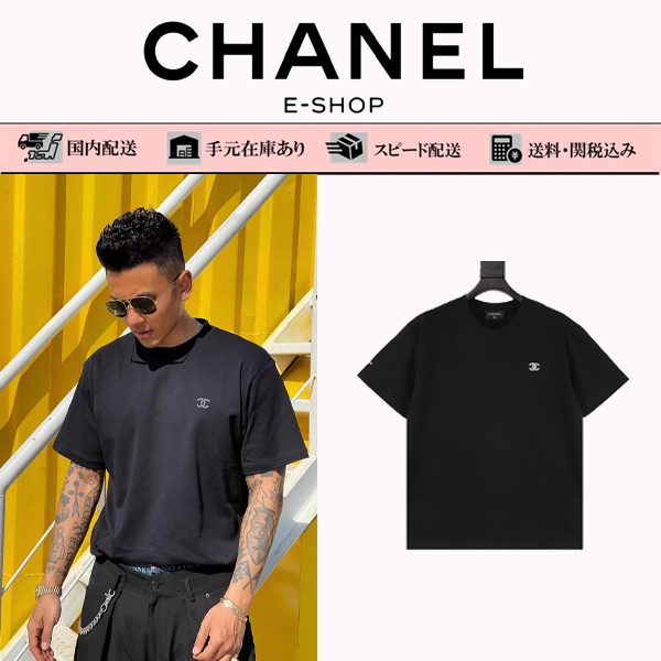 CHANEL /シャネル胸にテープを押してLOGOプリントラウンドネック半袖