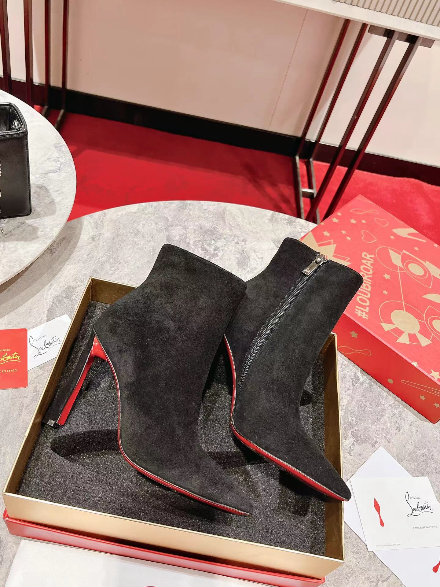 A thoroughly modern piece, the Condora Booty features Maison Christian Louboutin's architectural Plume heel, which reveals a flash of Loubi red. Set on a 100 mm heel, the sumptuous veau velours suede upper, features a straight cut across the ankle. This booty features a timeless stiletto boot design, with a zip closure on the inside and pointed toe.