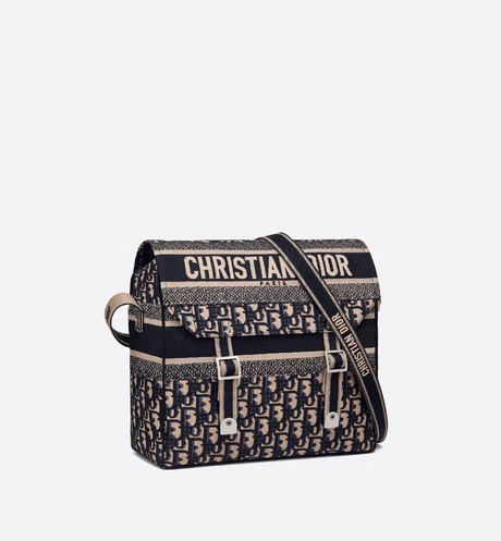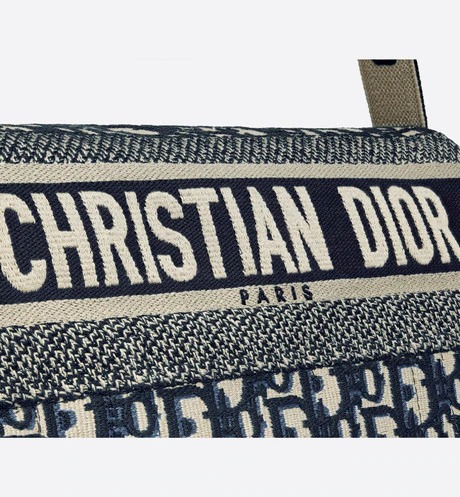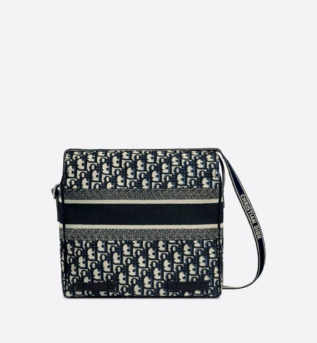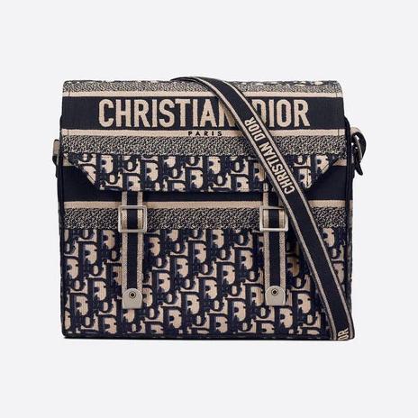 Maria Grazia Chiuri has redesigned the classic messenger bag by adding signature Dior elements for a casual and modern look. The style is entirely embroidered with the blue Dior Oblique motif. and is enhanced by a 'CHRISTIAN DIOR' signature across the front. The generous shape makes it an ideal companion for the city. Featuring an adjustable shoulder strap. the messenger bag can be worn over the shoulder or crossbody.