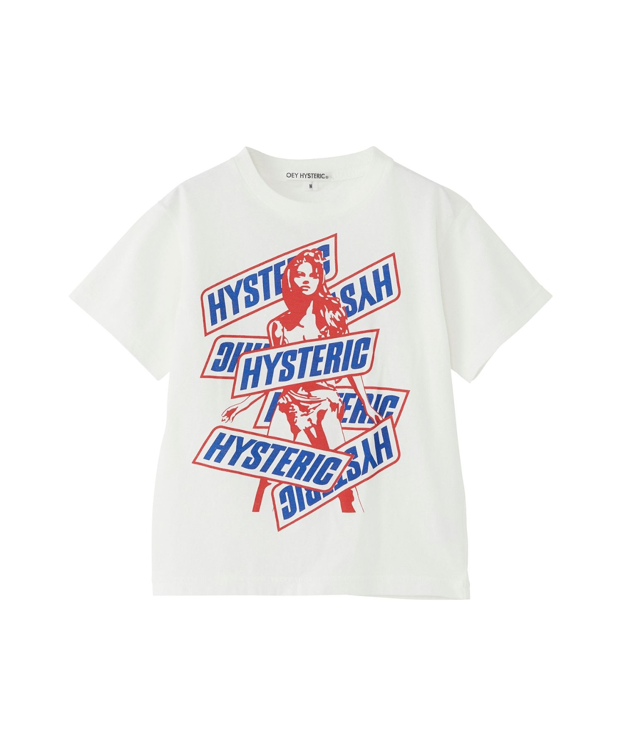 ランダムに配置した企業系ロゴと、HYSTERIC WOMANを組み合わせたデザインのTシャツです。