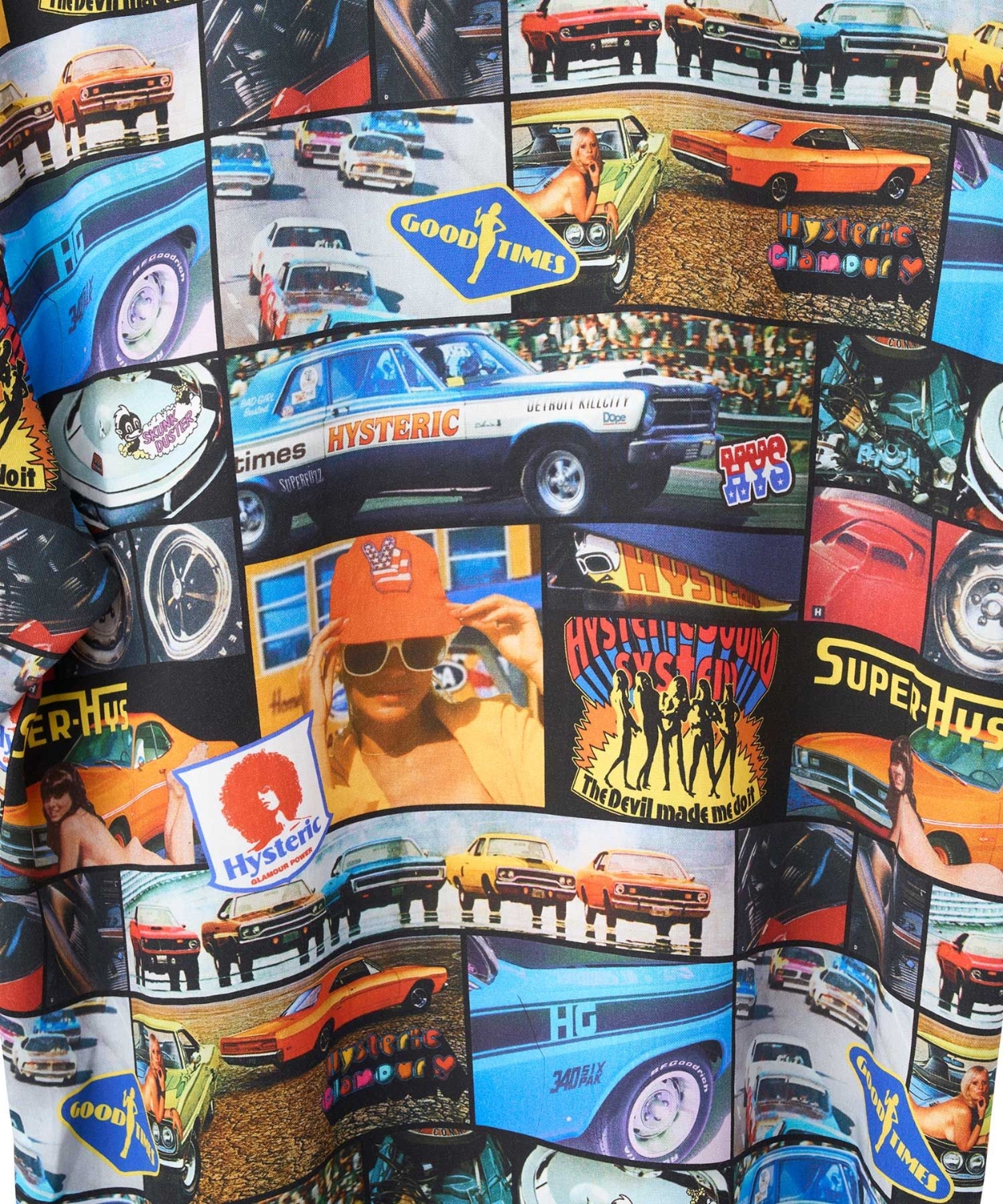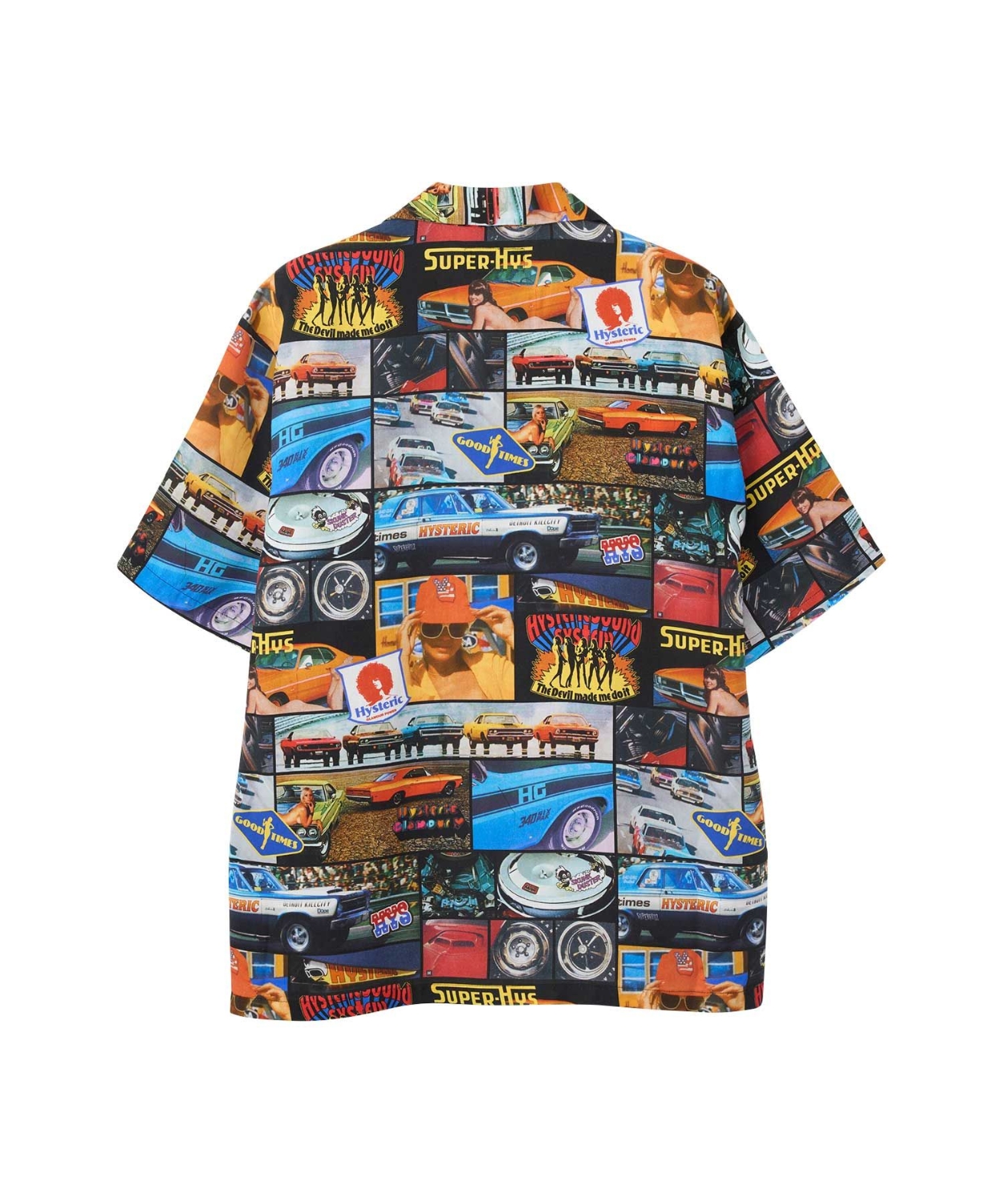 60年代後半から70年代前半のアメリカンマッスルカーにフォーカスし、HYSTERIC WOMANを組み合わせたオリジナルフォトプリント総柄デザインのアロハシャツ。