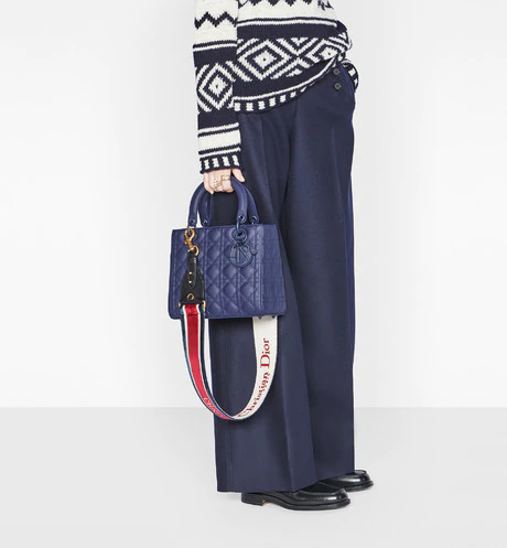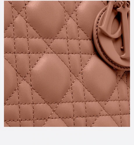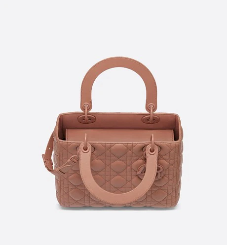 The Lady Dior handbag epitomizes the House's vision of elegance and beauty. Sleek and refined. the timeless yet relevant style is crafted in blush ultramatte calfskin with Cannage stitching. creating the instantly recognizable quilted texture. The tonal metal 'D.I.O.R.' charms complete and illuminate the silhouette. Featuring a thin. removable leather shoulder strap. the medium Lady Dior bag can be carried by hand. worn over the shoulder or crossbody.