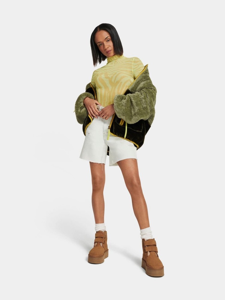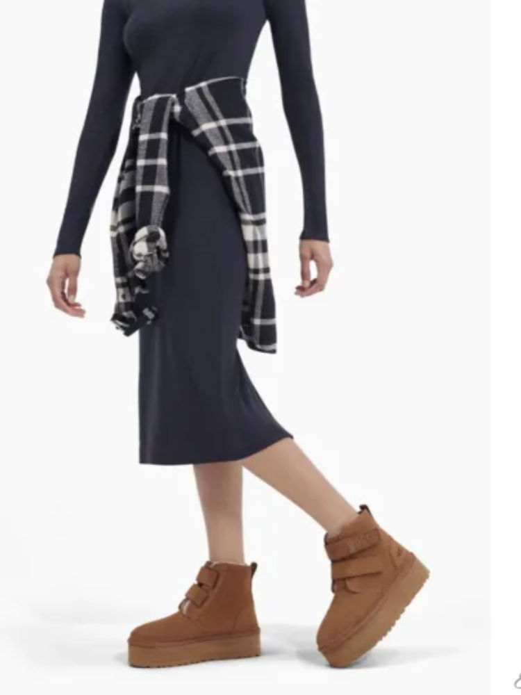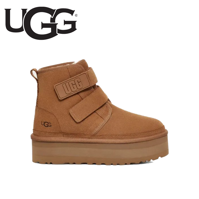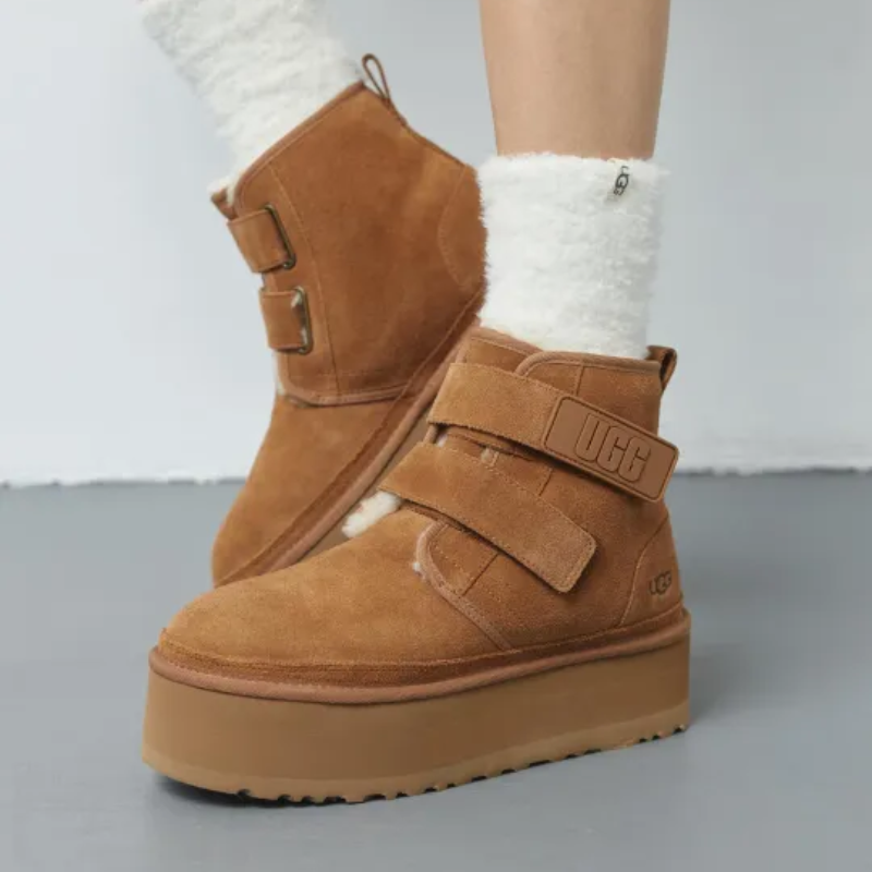 人気のチャッカブーツNeumelを再構築し、約5cmのプラットフォームソールでアップデートしたNeumel Platform(ニューメル プラットフォーム)。オリジナルと同じスエードに加え、UGG®のシグネチャーであるUGGplush™ウールブレンドのライニングが施され、厚底ソールでもクッション性が高く、ソフトな履き心地が特徴です。面ファスナー仕様のストラップで簡単に着脱できます。