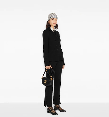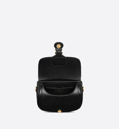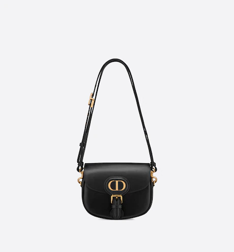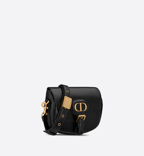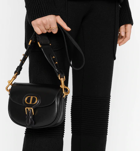 The Dior Bobby bag is a hobo style showcasing sophisticated lines and harmonious proportions. The silhouette is crafted from black box calfskin with a suede calfskin interior for added suppleness. and is enhanced by antique gold-finish metal hardware. Its removable and adjustable shoulder strap has a military-inspired buckle. and allows the small bag to be carried by hand. worn over the shoulder or crossbody.