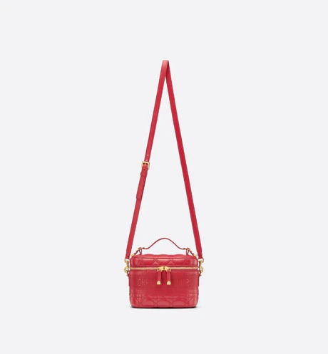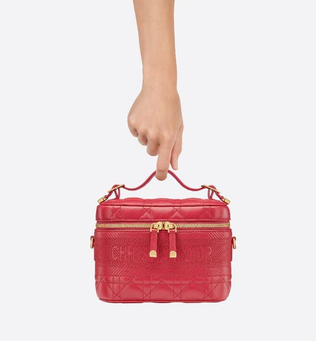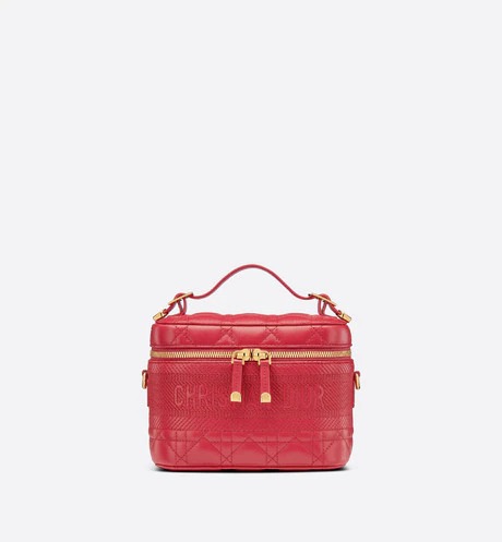 The DiorTravel vanity case. crafted in raspberry supple lambskin. is enhanced by Cannage topstitching and a band embossed with the 'CHRISTIAN DIOR' signature. The design can accommodate a phone. a wallet. a case for AirPods and a notebook. The small accessory is an ideal daily companion and can be carried by hand. worn over the shoulder or crossbody thanks to its handle and removable shoulder strap.