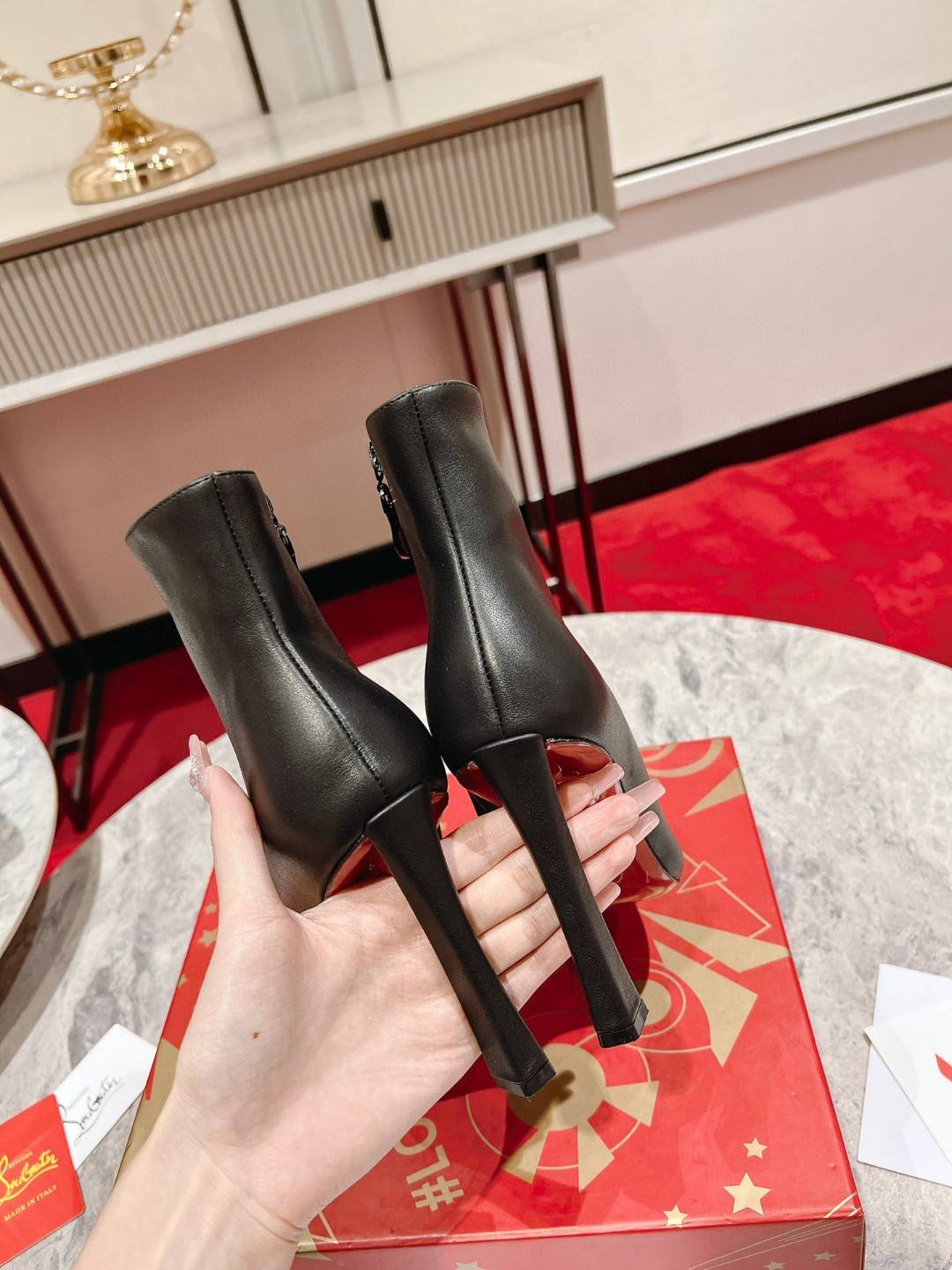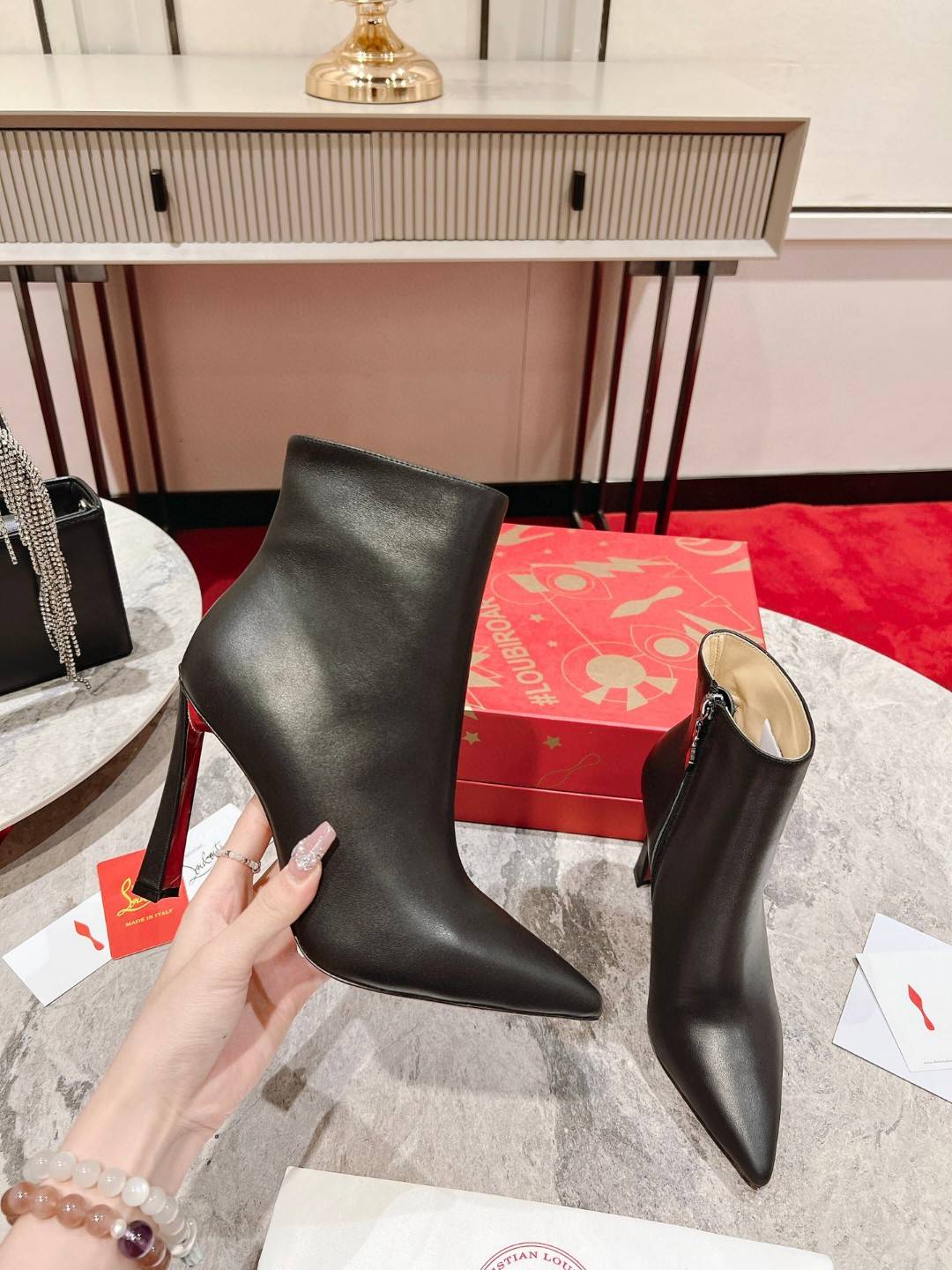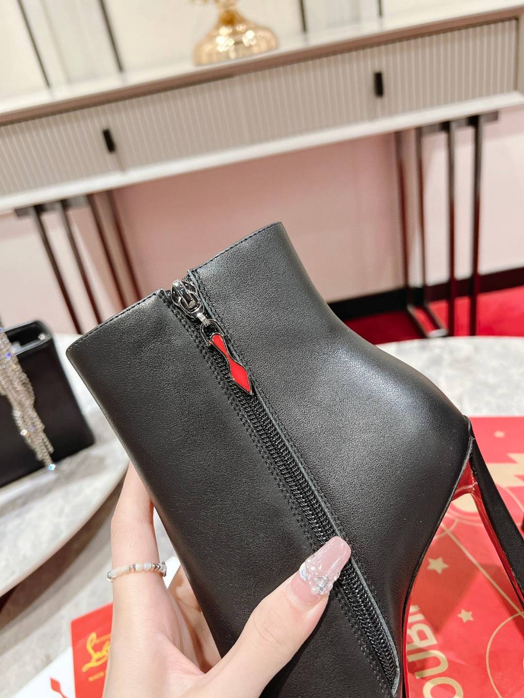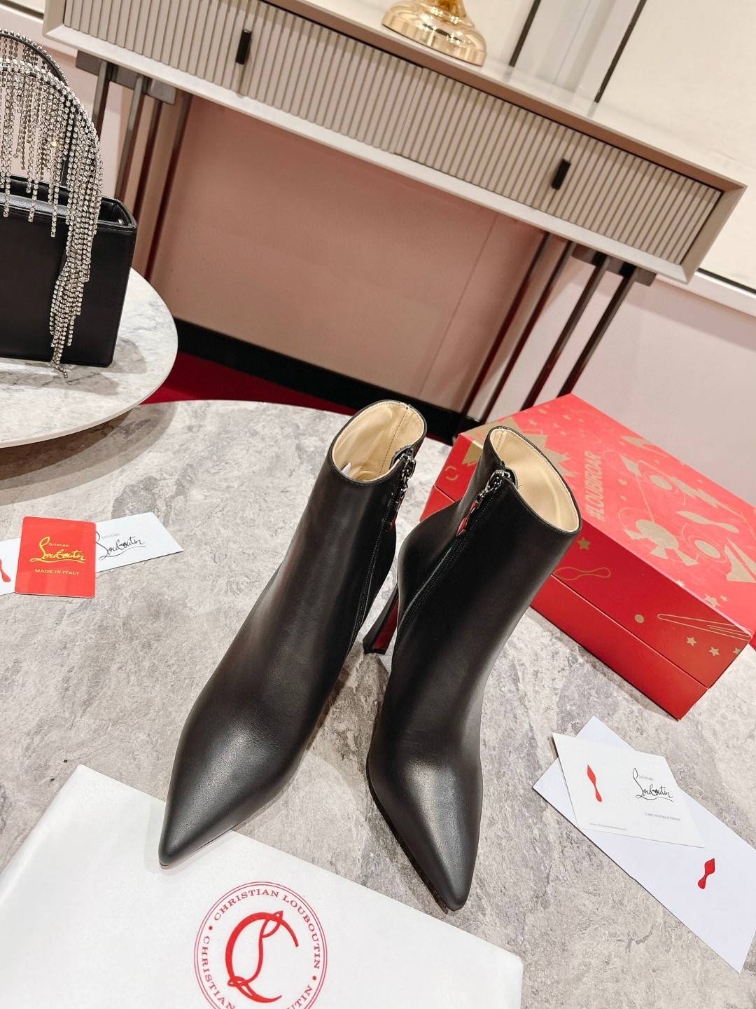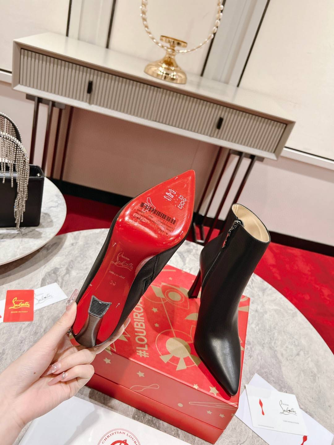 The timeless and elegant So Eleonor ankle boot highlights the foot with its sophisticated style. This black calfskin model features discreet tone-on-tone stitching. It sits on an iconic 85 mm cross heel and has a sober and refined allure. Its harmonious and refined aesthetic testifies to the expertise of Maison Christian Louboutin.